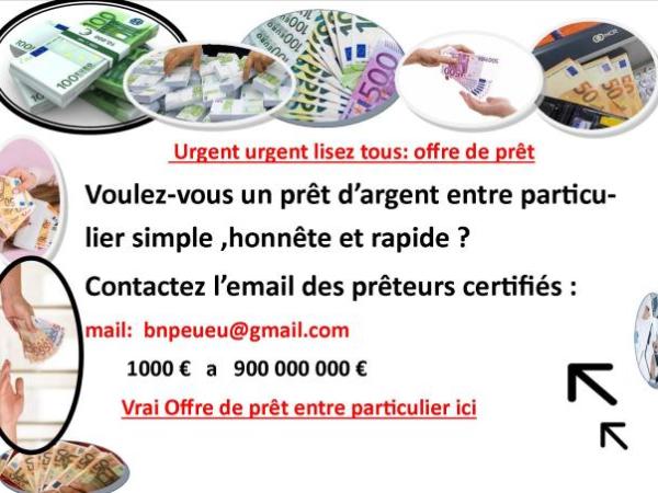 contactez-nous : ( com.proffesionnel@gmail.com )Nous donnons de 1000€ a 90 000 000€. Bonjour a tous